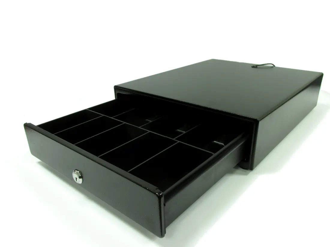 Касови сейф / чекмедже малък, метален, с ключ. Кабел за връзка към касов апарат или фискален принтер. Възможност за отваряне по команда от фискални устройства TREMOL притежаващи съответния изход.